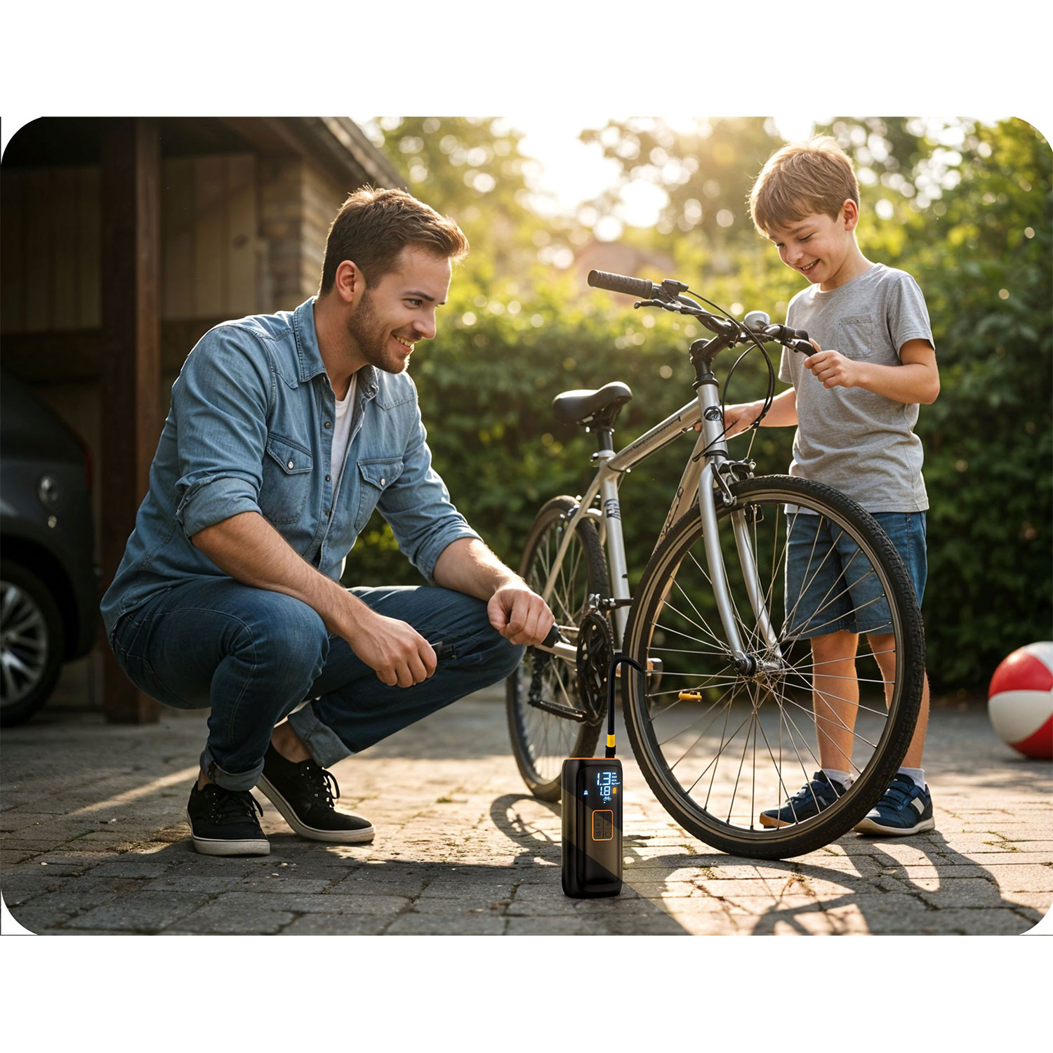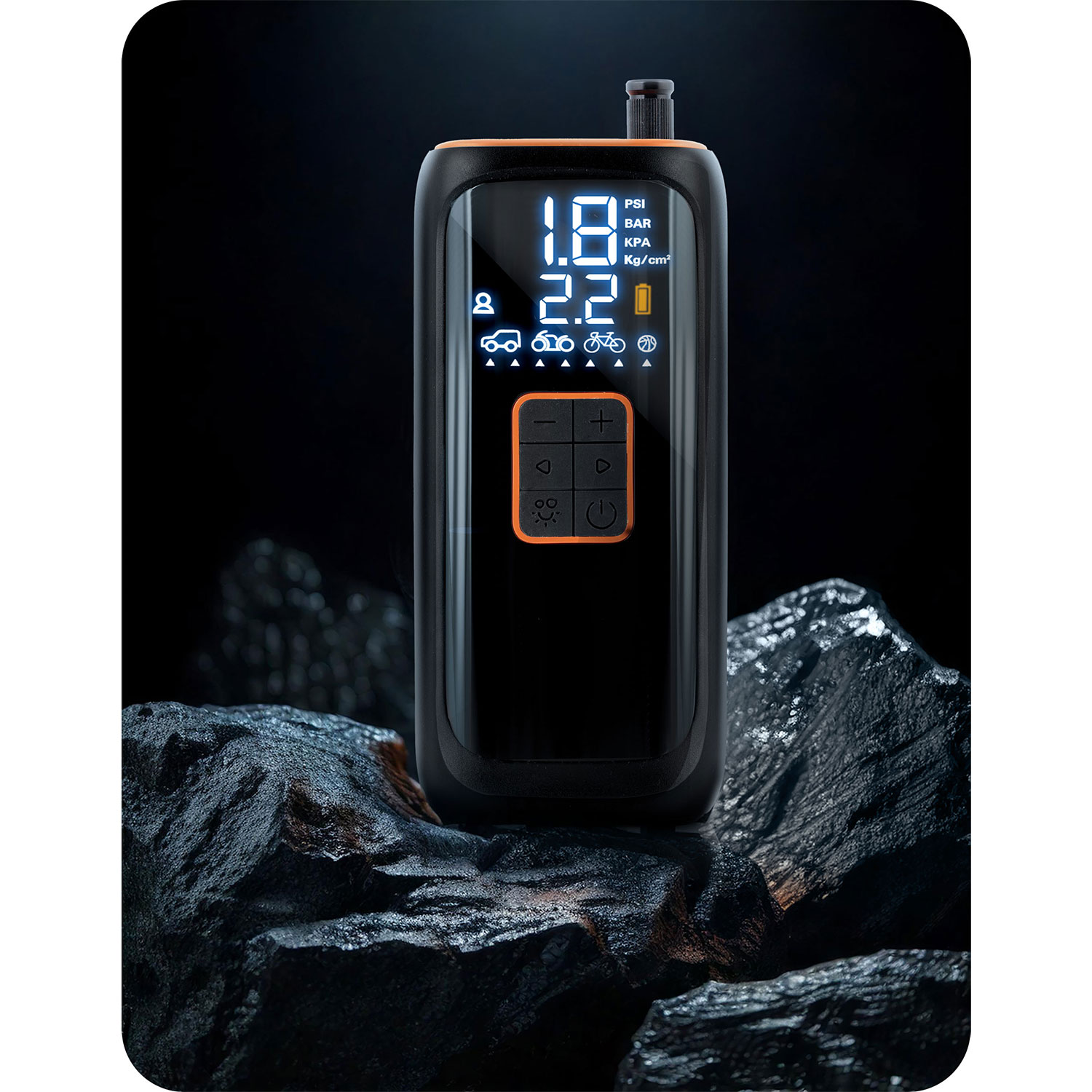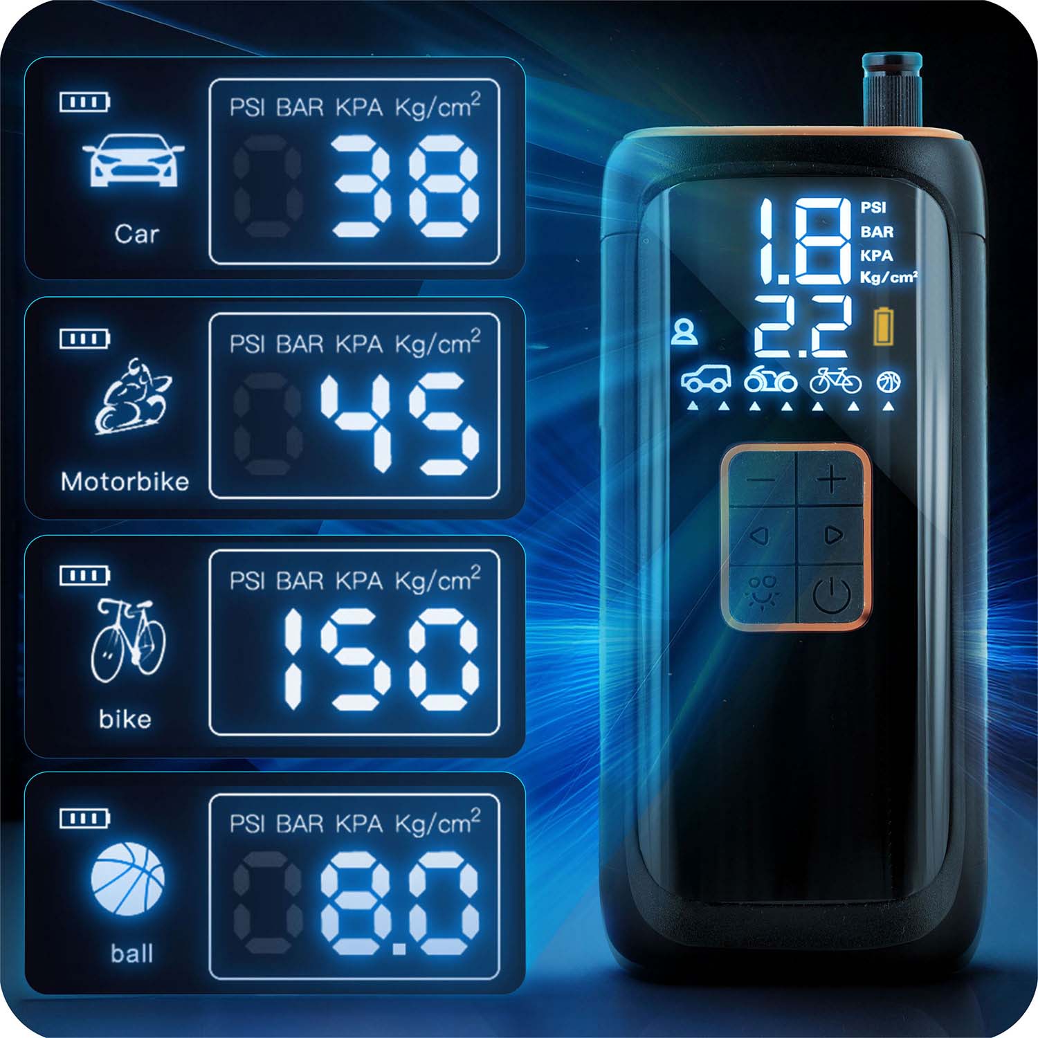 See minikompressor pakub võimsat jõudlust kompaktses pakendis. See täidab hõlpsalt auto-, mootorratta- ja jalgrattarehve ning tänu sisseehitatud rõhuandurile lülitub see automaatselt välja, kui seatud rõhk on saavutatud.