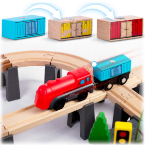 See raudteeliin veduri, vaguni ja teiste sõidukitega julgustab mängima ja mänguliselt uurima liiklust, märke ja sõidumehaanikat.