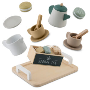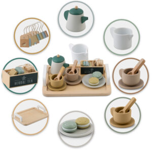 Komplekt sisaldab kvaliteetseid puidust elemente, nagu kann, tassid, lusikad ja serveerimisalus. Sellel saab serveerida ka makroone ja asetada tassidesse kaasasolevad teekotid, lisades kogu stseenile autentse hõngu ja võimaldades teie lapsel korraldada elegantseid pidusid.